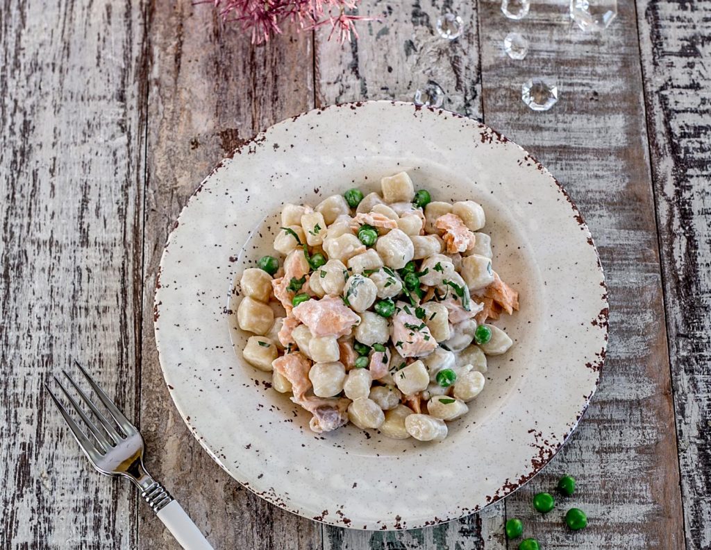 Ingredienti per 4 persone: gnocchi a piacere g 600, filetti di salmone mondati g 200, piselli surgelati g 200, 1 cipollotto, 1 rametto di rosmarino, 1 ciuffo di aneto, panna g 100, olio, sale e pepe.
