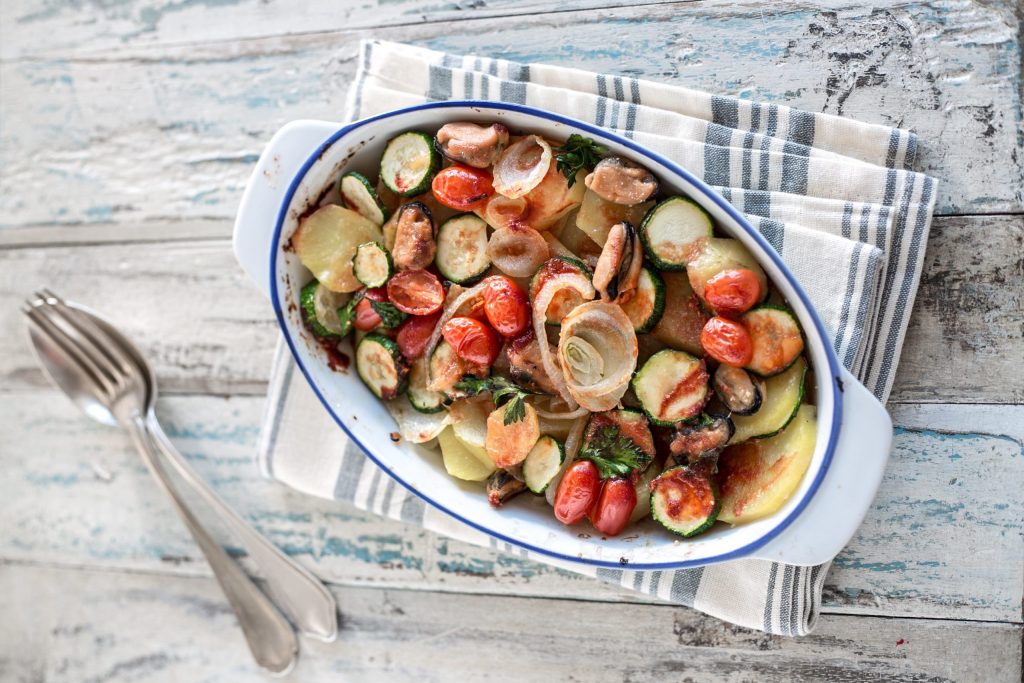 Ingredienti per 4 persone: cozze 1,5 kg – patate 400 g – 2 cipolle – 2 zucchine – pomodori datterini – salsa di pomodoro – grana – prezzemolo – olio di oliva – sale e pepe.