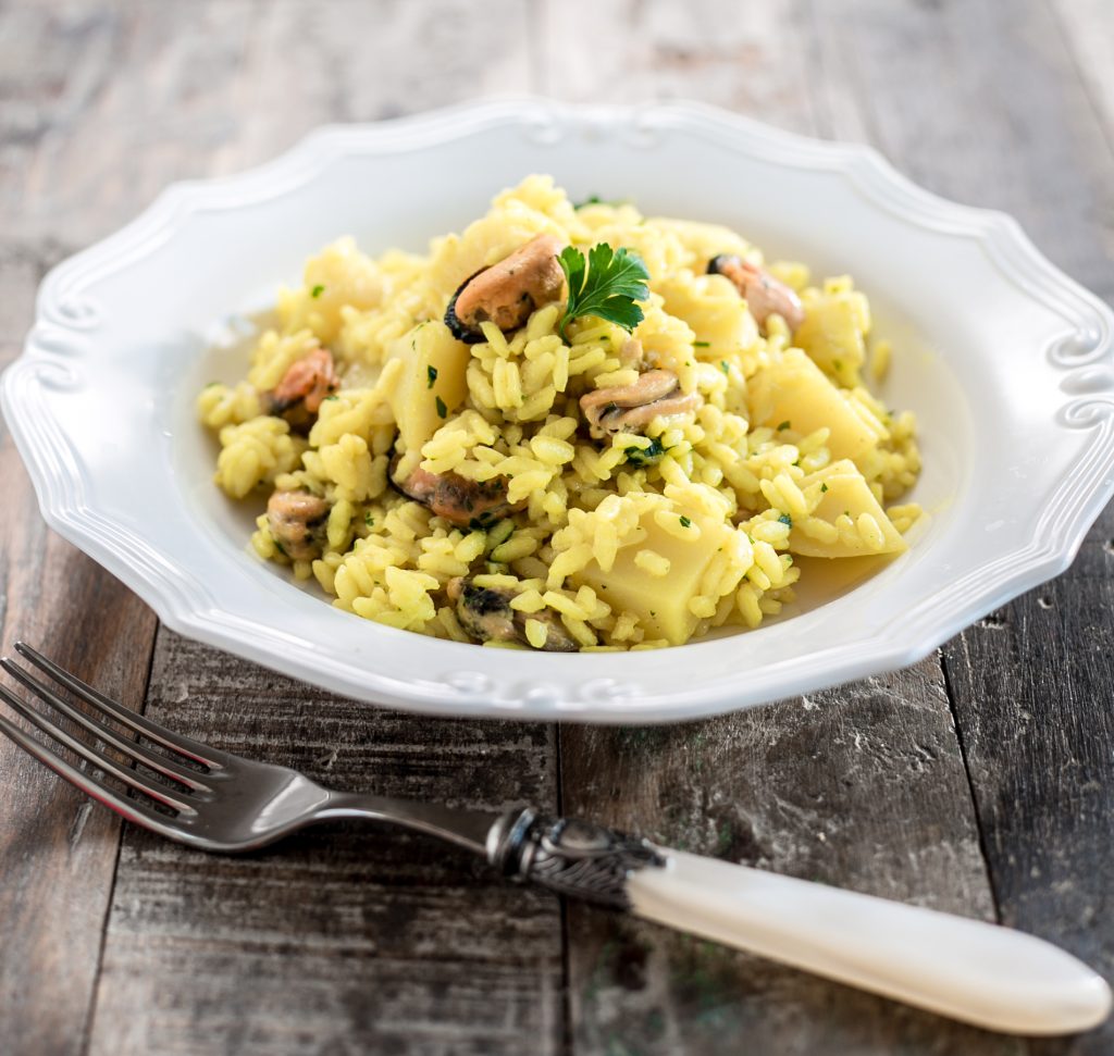 Ingredienti per 4 persone: cozze 1 kg – riso 250 g – 2 patate – grana – prezzemolo – 2 bustine di zafferano – olio – sale – peperoncino.