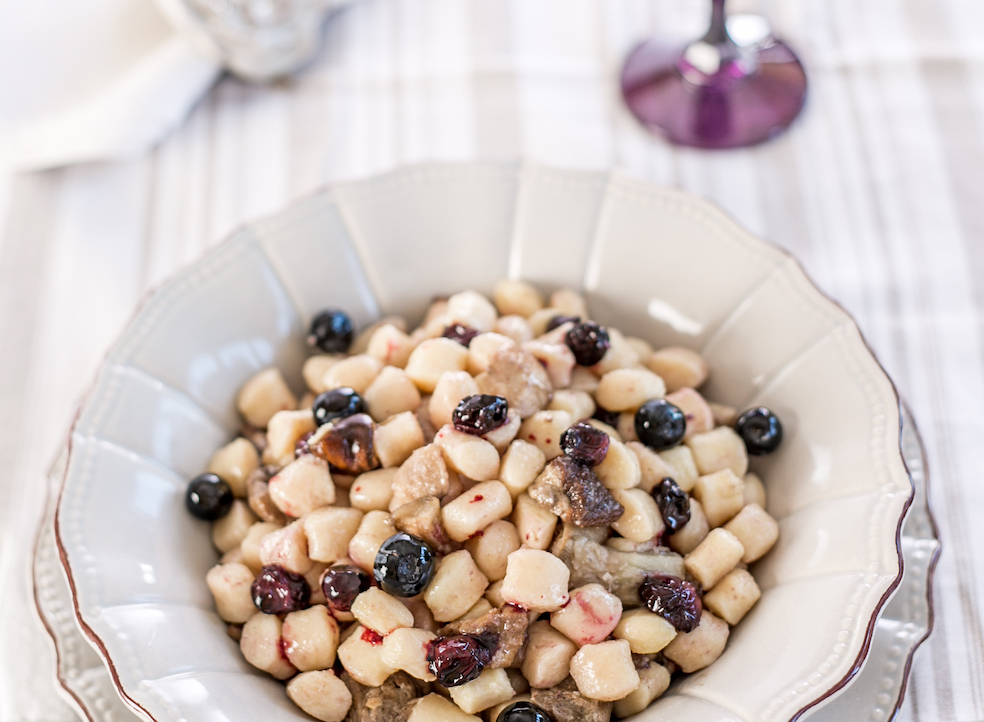 Ingredienti per 4 persone: 600 g di gnocchi a piacere – 200 g di funghi a piacere – 100 g di mirtilli – 1 cucchiaino raso di zucchero – sale – 1,5 dl di brodo di carne concentrato – burro – 2 cucchiai di olio – sale.