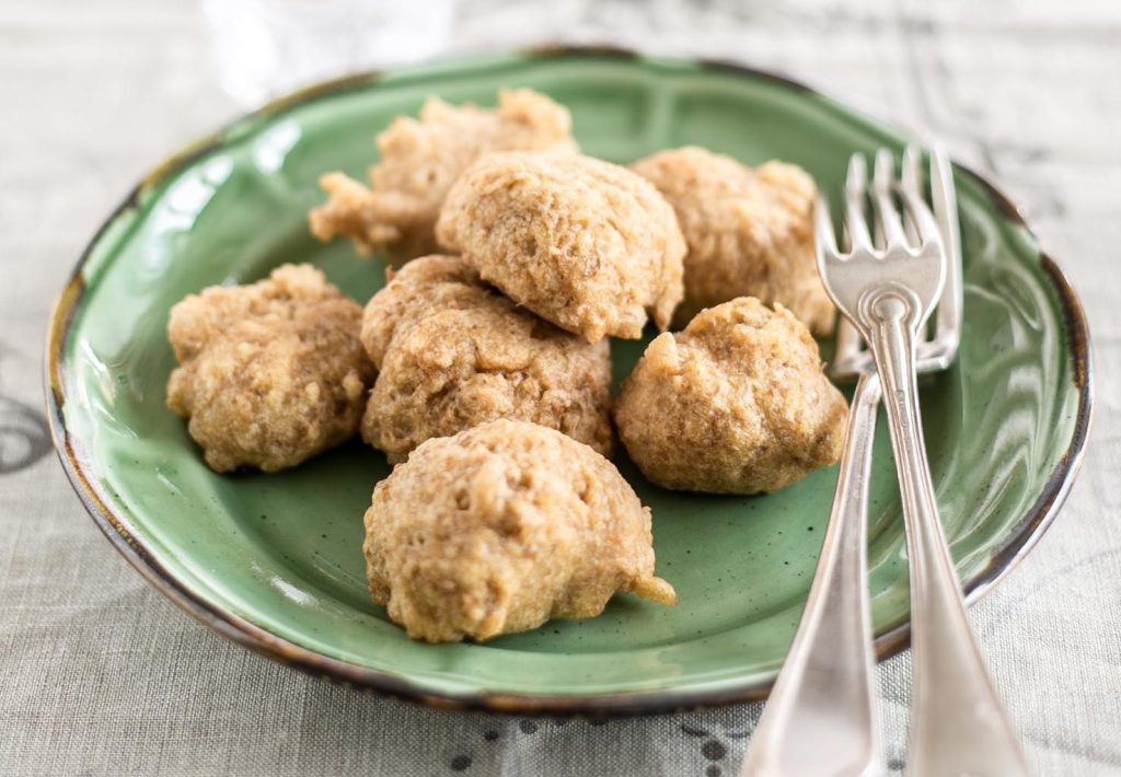 Ingredienti per 4 persone: 300 g di lenticchie cotte – 200 g di farina – 200 cl di latte – 1 uovo – 1 tuorlo – ½ cucchiaino di peperoncino in polvere – ½ bustina di lievito – un pizzico di zucchero – olio di semi per friggere – sale.