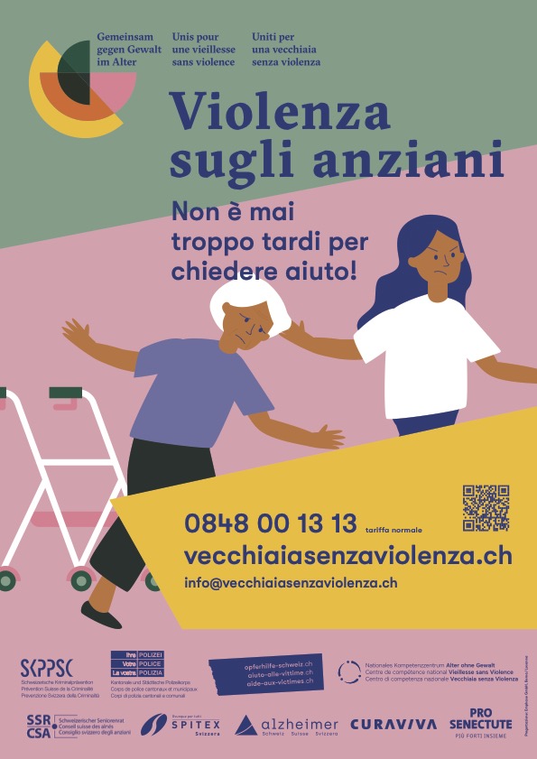 «Non ti do più i soldi per la parrucchiera, alla tua età non ne hai più bisogno», «Ora non le do più niente da bere, perché altrimenti bagnerà di nuovo il letto», «Mi fai male quando mi strattoni perché sono troppo lenta». Sono solo alcuni degli esempi di violenza sugli anziani messi in primo piano dalla nuova campagna nazionale di informazione e sensibilizzazione promossa da Prevenzione Svizzera della Criminalità, dal Centro di competenza nazionale «Vecchiaia senza Violenza» e dall’Aiuto alle vittime di reati. Lanciata negli scorsi giorni la campagna è sostenuta da diverse organizzazioni attive nel settore della vecchiaia e si rivolge principalmente alle persone anziane, incoraggiandole a parlare del tema e a chiedere aiuto, ma anche a coloro che vivono nel loro entourage, a chi si occupa delle cure e agli autori o alle autrici di violenza.
