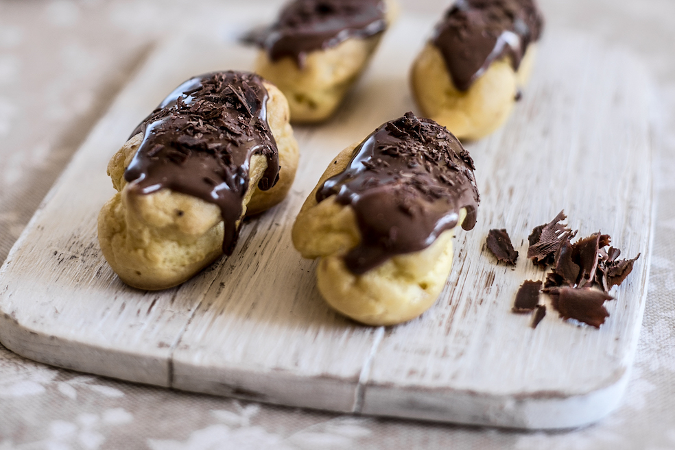 Ingredienti per 20 eclair: 1,25 dl di acqua – 60 g di burro – 75 g di farina – 2 uova – sale. Per la farcia: 400 g di crema pasticciera – 150 g di cioccolato fondente.