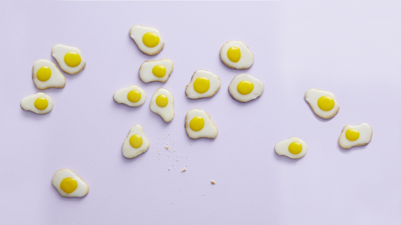 Ritagliate i biscotti a mano libera per ottenere dei dolcetti molto simili alle uova al tegamino. Se invece preferite biscotti più uniformi, disegnate delle forme su carta e usatele come modello per ritagliare i vostri biscotti.