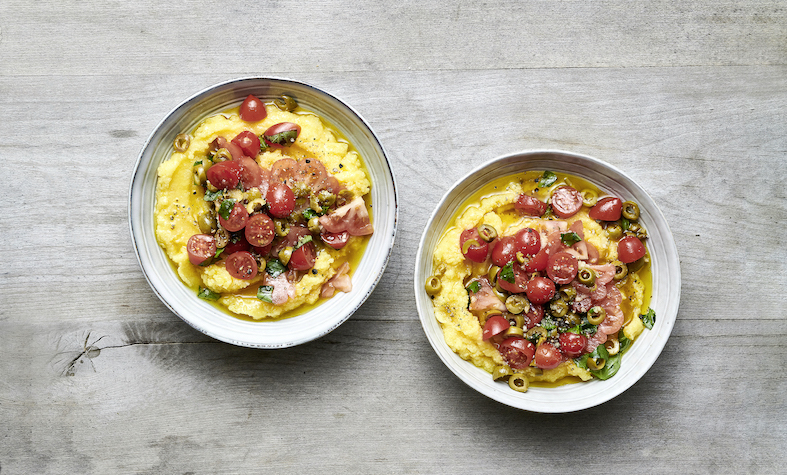 Ingredienti per 4 persone: 800 g di pomodori, ad esempio cuore di bue e pomodori datterini; 100 g d’olive verdi snocciolate; 4 c d’olio d’oliva; 2 spicchi d’aglio; sale; pepe; ½ mazzetto di basilico; 2 l di brodo di verdura; 320 g di semola di mais macinata fine, polenta «due minuti»