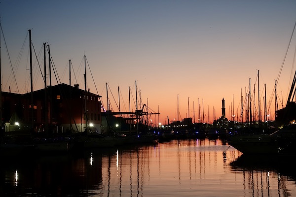 E così torno al Porto Antico, mentre il sole già imporpora il mare su cui si staglia la sagoma scura della Lanterna, il faro simbolo di Genova, alla cui ricostruzione nel 1543 collaborano il buon Bernardino Cantoni, sempre lui, e Francesco di Gandria, allora architetto del Comune.