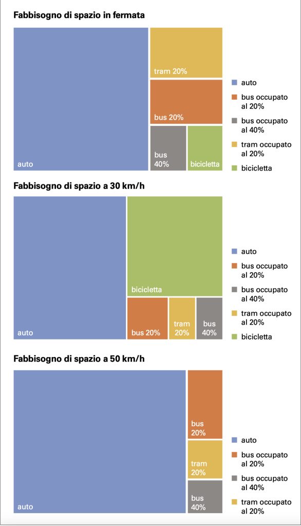 Quanto spazio ha bisogno la mobilità? Cioè quanto territorio si deve dedicare a strade, ferrovie, ciclopiste? La domanda non è oziosa, anche da noi gestire su un territorio circoscritto, soprattutto nelle città e negli agglomerati, i bisogni della residenza, degli impianti produttivi, delle infrastrutture di servizio, delle aree agricole, degli spazi ricreativi di prossimità e delle superfici per mantenere la biodiversità è divenuto un rompicapo. Emblematica è, ad esempio, la discussione sulle velocità: 20, 30 oppure 50 km/h da assegnare ai vari tratti della rete stradale. Essa in realtà riflette lo scontro tra i diversi utenti (abitanti, pedoni, ciclisti, automobilisti, utenti dei trasporti pubblici) per disporre di un proprio spazio vitale.