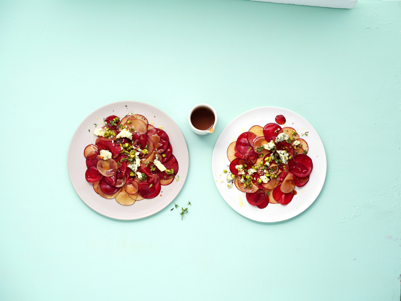 Ingredienti per 4 persone: 30 g di pistacchi; 2 rametti di timo; 2 c di zucchero; 6 susine non troppo molli, ad esempio rosse e a polpa rossastra; 1 limone; 3 c di sciroppo di datteri; 2 c di senape; 6 c d’olio d’oliva; 50 g di formaggio erborinato, ad esempio stilton; pepe nero macinato fresco; sale