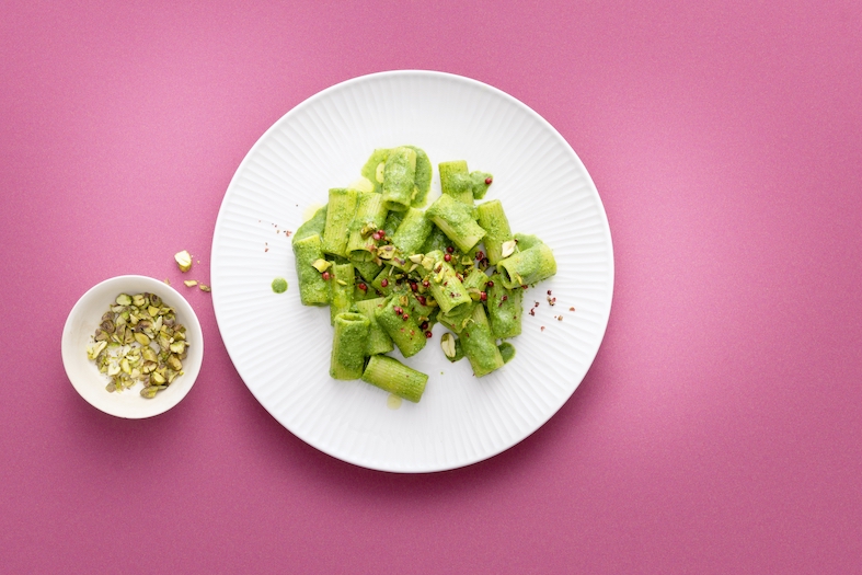 Ingredienti per 4 persone: 1 mazzetto di basilico; 200 g di spinaci per insalata; 500 g di rigatoni; 80 g di formaggio fresco di capra; 1 spicchio d’aglio; 40 g di parmigiano grattugiato; 4 c di pistacchi tostati e salati; 1 dl d’olio d’oliva; pepe rosa