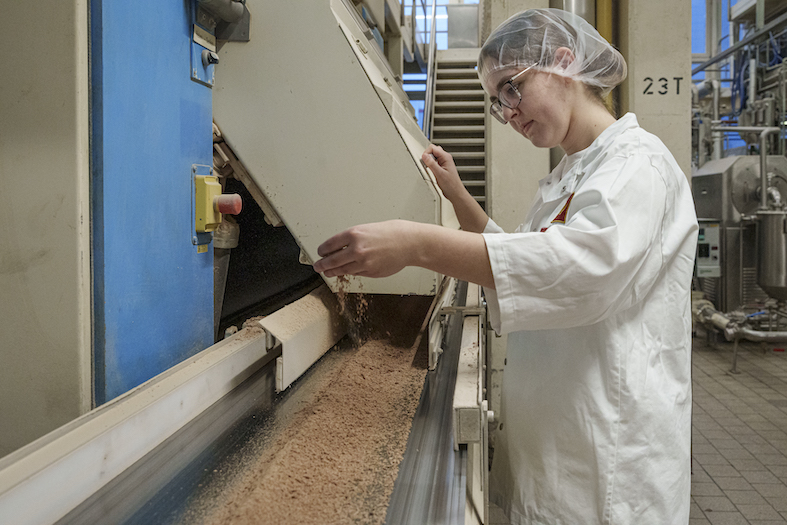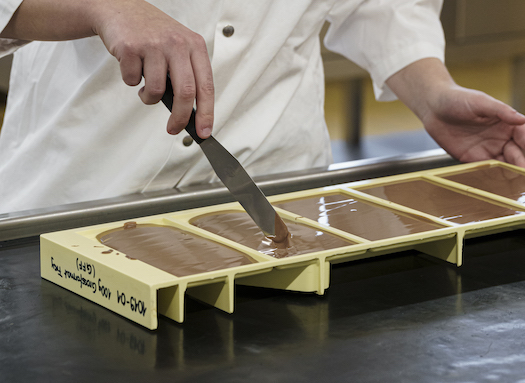 In un tripudio di aromi inebrianti, il cioccolato concato viene infine versato negli stampi delle tavolette, che vengono poi scossi per distribuire uniformemente la massa. Dopo quaranta minuti nella torre di raffreddamento si dà un altro colpetto e le tavolette da 100 grammi cadono belle e pronte dai loro stampi. L’operatore di linea di produzione, Thomas Exner, è al nastro trasportatore e sta togliendo le tavolette con delle imperfezioni. Ma in base a quale criterio? Le tavolette non sembrano tutte uguali? «Decisamente no», sogghigna e ne toglie un’altra dal nastro, «qui c’è un punto un po’ scuro. Capita perché prima abbiamo fatto cioccolato fondente». Un occhio inesperto non l’avrebbe mai notato. Ciò che invece non soddisfa quello di Exner, viene riposto in una sacca sterile, rifuso e poi riutilizzato.