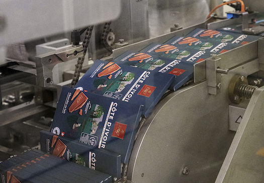 Al piano superiore, dove un ascensore a paternoster trasporta le tavolette per l’imballaggio, opera un gruppo di donne non meno meticolose: ciò che la macchina non ha piegato o incollato con precisione millimetrica, loro lo riaprono e lo rimettono a posto. Alla fine, il macchinario mette venti tavolette in una scatola, o meglio, le avvolge in un cartone bianco e ci pone sopra un’etichetta con la data di produzione. Poi le scatole tornano con un altro piccolo ascensore al piano terra e vengono disposte su una paletta. La paletta viene poi caricata su un vagone ferroviario che viene trainato da una locomotiva di manovra fino al vicino villaggio di Suhr, al centro di distribuzione Migros. Da qui, la «Côte d’Ivoire» arriva nelle settecento filiali del Paese.