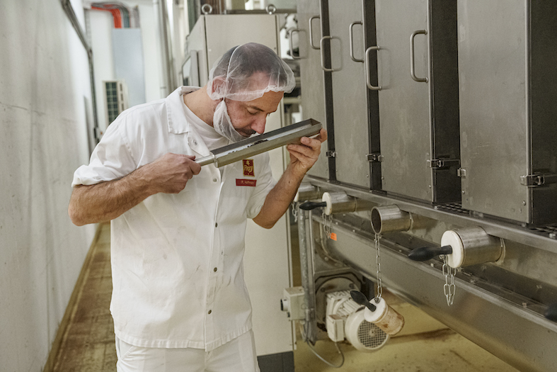 Ogni singola fase del processo si svolge in un capannone dedicato. In uno c’è un leggero ronzio, nel successivo un sonoro borbottio e in quello dove il latte viene concentrato rimbomba un rumore tremendo. Vera Hug, mentre noi tendiamo l’orecchio avvicinandoci alla sua bocca, ci spiega urlando che «adesso il latte viene sottoposto a vapore sotto vuoto». Alla fine, il contenuto di acqua è ancora del 50%, sebbene il lavorato risulti ben più denso rispetto allo stato iniziale: il latte della mucca contiene infatti l’87% di acqua.