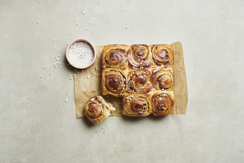 3. Arrotolate la pasta sul lato più lungo. Tagliate il rotolo a rondelle di 4–5 cm di larghezza e accomodatele nella teglia, lasciando un po’ di spazio tra una e l’altra. Coprite e lasciate lievitare per 30 minuti in un luogo caldo.