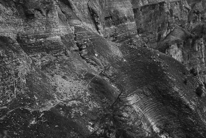 Con ben 45 minuti di anticipo sui primi alpinisti, sono pronto a iniziare la mia avventura imboccando uno stretto sentiero blu. A ridosso della parete sud orientale il primo tratto è inclinato verso il burrone. Da vicino appare come un ammasso di tegole di granito prodotte dall’erosione che finiscono nell’abisso a strapiombo. È uno di quei tratti in cui la montagna sembra avere un proprio sistema vascolare, dando vita a sottili cascate che rammentano larghe scie di sudore. Mi muovo con cautela, concentrandomi sul baricentro.