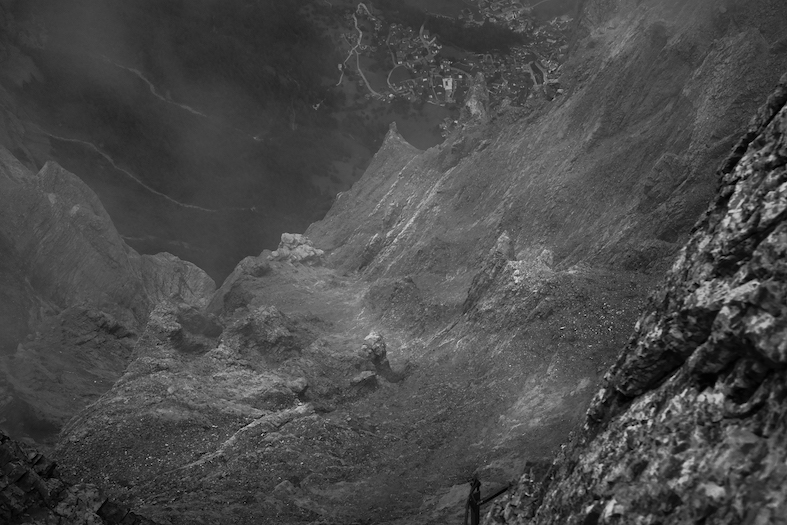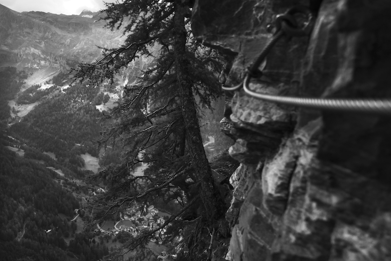 Comincio con molta esitazione la grande via ferrata, la Leukerbadner, in un posto chiamato la «Untere Schmitte» situata a un’altitudine di 2031 m s.l.m. Mi ci vogliono pochi minuti per abituarmi alla vista di questo umido e scivoloso sentiero che diventa sempre più domabile con l’apparire dei primi raggi del sole. La stretta via conduce a un passaggio chiamato il «Naso», primo vero assaggio di quella che sarà l’intera scalata. Benché non necessiti di una grande tecnica, il tratto appare molto esposto, tanto da diventare una sorta di campanello d’allarme per i meno esperti.