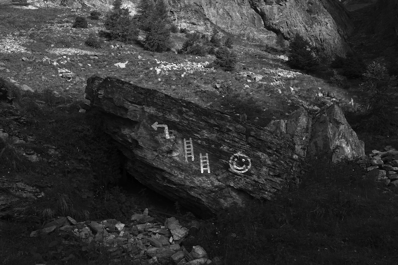 Al di là della mia schiena, con la coda degli occhi, vedo Leukerbad, la mia macchina e le rive del fiume dalle quali prendevo le misure del tracciato. Sulla mia destra i primi alpinisti arrivati con la funicolare stanno per superare il deposito di detriti di granito. Mi rimetto in cammino. La salita verticale comincia alla Grasrücken, è qui che viene dato il via allo spettacolare alternarsi di pareti di roccia sulle quali è un piacere aggrapparsi.