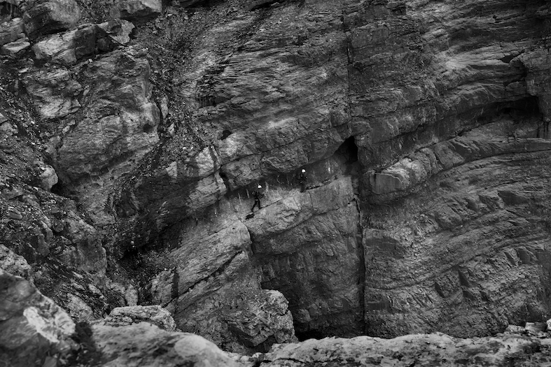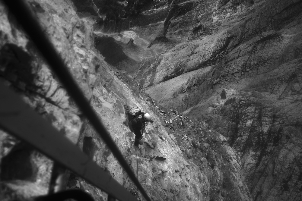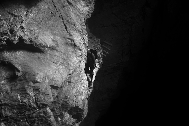 Mi spingo lungo la parete ovest, nelle profondità della grotta, dove trovo sollievo sotto una piccola cascata. È la miglior doccia fredda che io abbia mai vissuto. Il getto d’acqua gelida mi avvolge di brividi che per la prima volta non sono causati della vertiginosa arrampicata: un rinfrescante toccasana. Fuori dalle viscere delle montagna continuo lungo un pilastro interminabile e stancante. Va detto che non mancano punti in cui si può riposare, facendosi superare dagli altri scalatori pur non essendo di alcun impiccio.