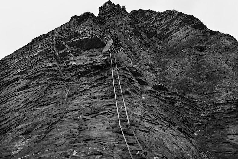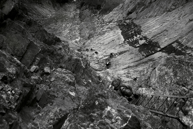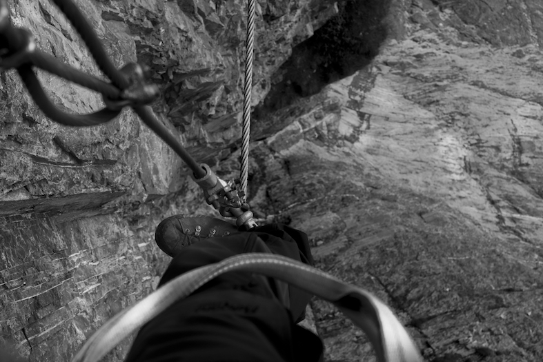 Secondo una guida locale sono molte le persone che «gettano la spugna» dinanzi a questa larga colonna rocciosa. Mi fermo a metà e, con il supporto di un cordino mi lascio pendere nel vuoto. Non è un esercizio che mi riesce facile ma è inevitabile per abituarmi alla lunga arrampicata che mi attende. Con i suoi 1000 m di dislivello, 2000 m di cavo d’acciaio, 216 m complessivi di scalette, la scalata ha una durata stimata di 6 ore durante le quali è indispensabile sapersi riposare in verticale. Poco dopo sono completamente rilassato e disteso nel vuoto del «Naso».