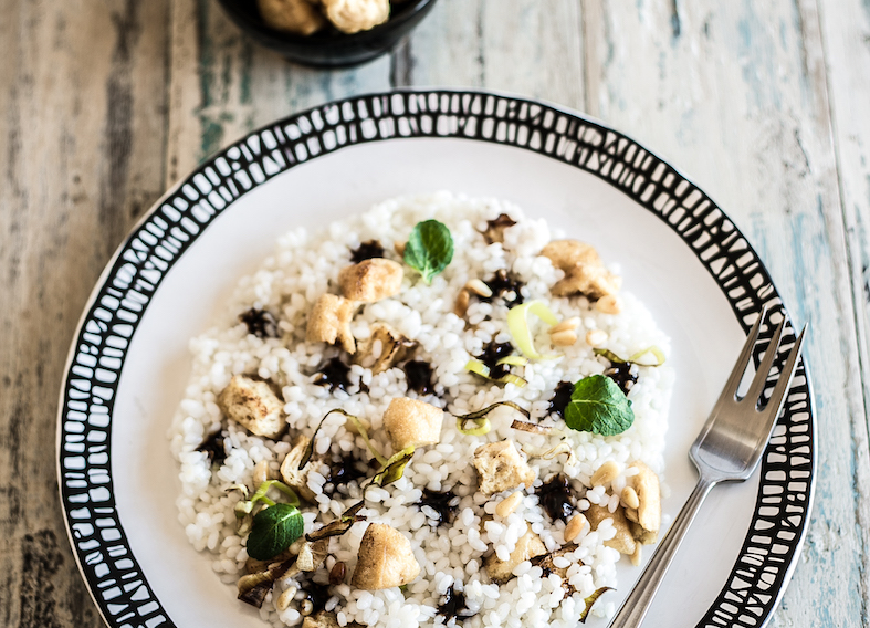 Ingredienti per 4 persone: 250 g di riso bianco tondo orientale – 200 g di tofu a cubetti piccoli – 100 g di pinoli – 1 cipollotto – foglie di menta – 1 cucchiaio di zucchero – salsa di soia – 4 cucchiai di olio di semi – sale e pepe nero.