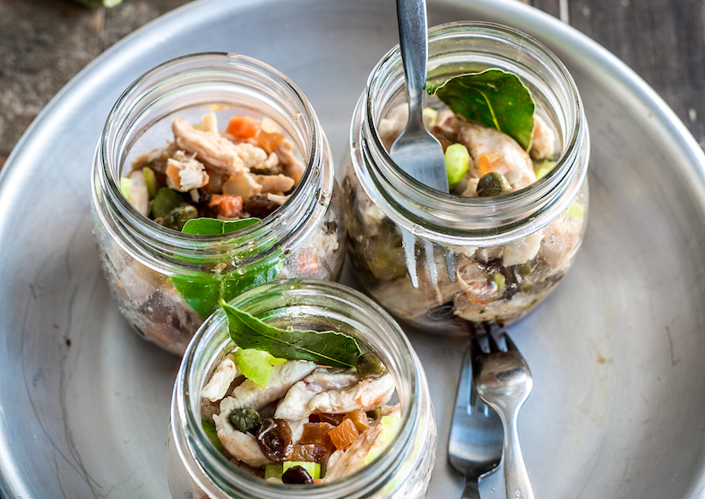 Tritate sottilmente tutte le verdure. Tagliate il petto di pollo a listarelle, poi battetele con un batticarne. Scaldate l’olio in una casseruola, aggiungete le verdure e rosolatele per 4 minuti. Unite le listarelle di pollo, 2 cucchiai di vino dolce, 1 cucchiaio di miele, 1 punta di concentrato di pomodoro stemperato in poca acqua, 2 cucchiai di aceto e 1 cucchiaio di zucchero di canna e mescolate. Suddividete il composto in 4 vasi, chiudeteli e proseguite la cottura a bagnomaria in forno a 160°C per 30 minuti. Servite accompagnando con riso pilaf.