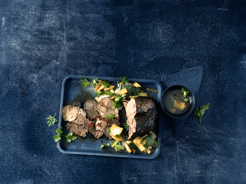 Ingredienti (per 4 persone): 10 peperoncini rossi; 1,5 kg d’arrosto di manzo, ad esempio spalla; 1 cc di sale; 200 g di sedano rapa; 200 g di porri; olio per la cottura; 1 cc di concentrato di pomodoro; 5 dl di vino rosso; 3 dl di fondo di manzo; ¼ di mazzetto di prezzemolo