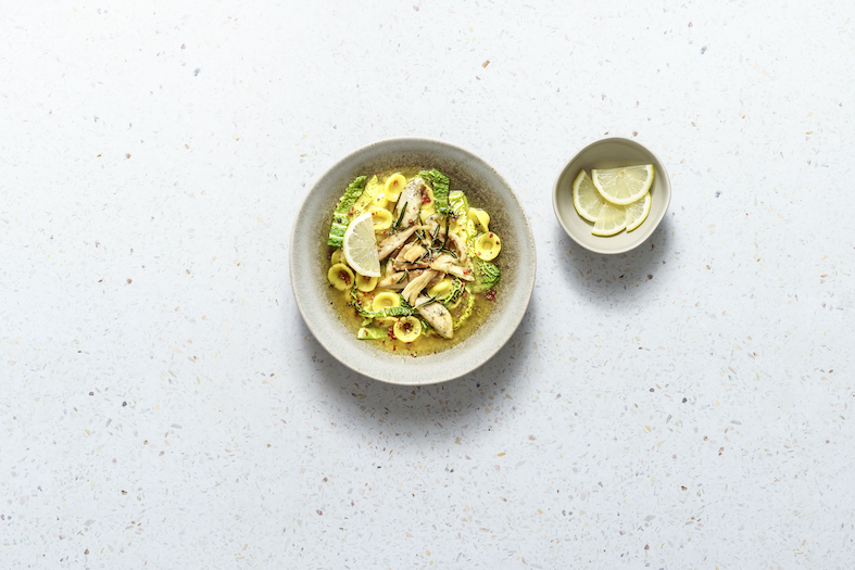 Ingredienti (per 4 persone): 4 cosce di pollo di ca. 250 g ciascuna; 1 limone; 8 dl di fondo di pollame; 5 dl di brodo di pollo; sale; 150 g di verza; 200 g d’orecchiette; ½ cc di curcuma; 2 rametti di rosmarino; 4 c d’olio d’oliva; 1 cc di pepe misto, ad esempio rosa e nero