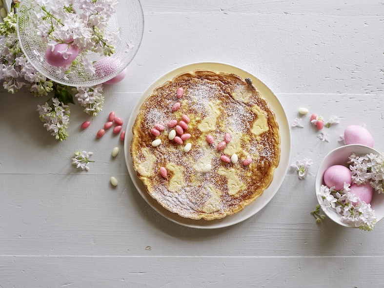 7. Dorate la torta nella parte bassa del forno per circa 30 minuti. Lasciatela raffreddare. Guarnitela con gli ovetti di zucchero e spolverizzatela con lo zucchero a velo.