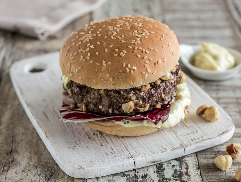 Ingredienti per 4 persone: polpa di manzo tritata o tagliata al coltello g 600 – pane da hamburger – nocciole tostate tritate g 150 – 4 cucchiai di verdure miste da soffritto – 1 rametto di timo – 1 tuorlo – 2 cucchiai di grana grattugiato – trevisana rossa – salsa tartara – olio, sale e pepe.