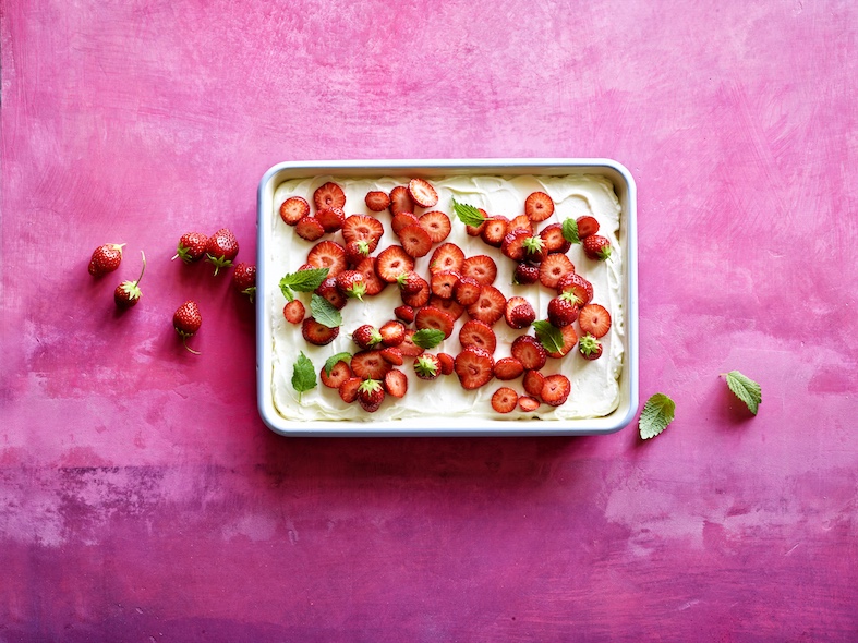 Ingredienti (per 8 persone(2 stampi di circa 16×24 cm): 300 g di rabarbaro, pesato mondato; 1 dl di sciroppo di fiori di sambuco; 250 g di mascarpone; 200 g di crème fraîche; 100 g di zucchero; 250 g di quark semigrasso; 400 g di fragole; 1 foglio di gelatina; 200 g di savoiardi; 2 c d’acqua; 2 c di sciroppo di fiori di sambuco