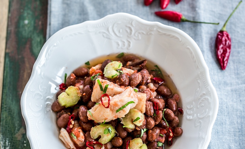 Ingredienti per 4 persone: 300 g di baccala pronto per l’uso – 300 g di fagioli a piacere lessati – 100 g di polpa di pomodoro – 50 g di pancetta a cubetti – brodo vegetale – 1 gambo di sedano – 1 spicchio d’aglio, peperoncino secco – 1 cucchiaio di prezzemolo tritato – olio – sale e pepe.