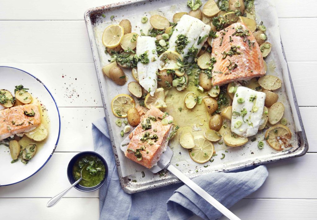 Piatto principale Ingredienti per 4 persone: 500 g di patate piccole, sale, pepe, 1,5 dl d’olio d’oliva, 300 g di filetti di salmone senza pelle, 300 g di filetti di merluzzo bianco, 1 limone, 80 g di cipollotti, ¼ di mazzetto d’erba cipollina, ¼ di mazzetto di prezzemolo, ¼ di mazzetto d’origano, 2 c di pinoli, 20 g di parmigiano