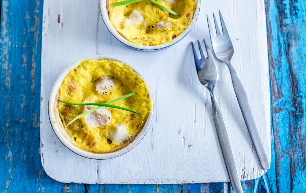 Ingredienti per 4 persone: 300 g di baccalà pronto per l’uso – 40 g di farina – 2 tuorli – 40 g di grana grattugiato – foglie di salvia – erba cipollina – 1 punta di noce moscata – ½ bicchiere di brandy – 400 g di latte – 70 g di burro – sale e pepe.