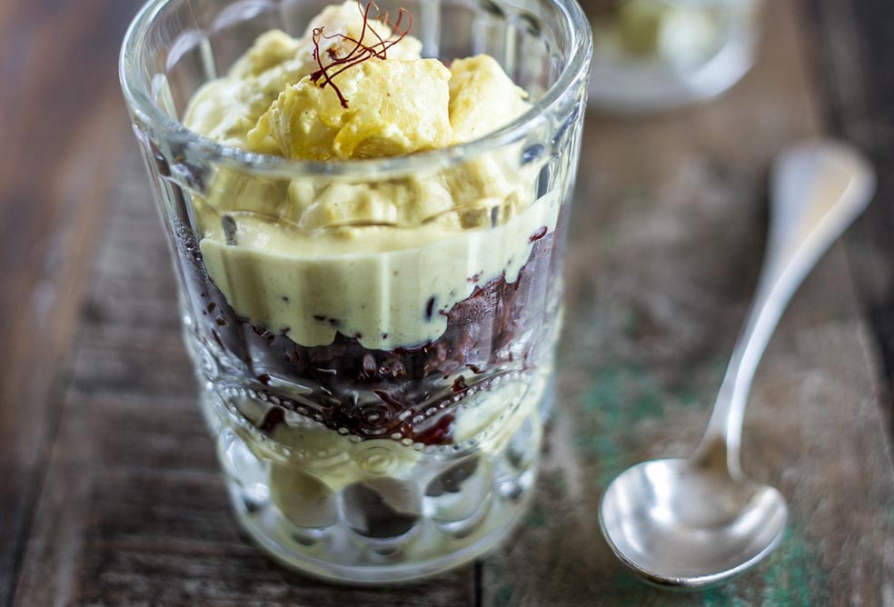 Cuocete il riso rosso per 20 minuti in acqua bollente, scolatelo, regolatelo di sale e tenetelo da parte. Lavate il baccalà e asciugatelo. Tagliatelo a cubetti di 2 cm per lato, mettendoli in una ciotola, quindi spolverateli con lo zafferano e poco sale. Scaldate l’olio e rosolatevi i cubetti a fuoco vivace per 1 minuto. Scolateli e teneteli da parte. Nella stessa padella rosolate lo scalogno tagliato sottile, unite i cubetti di pesce. Bagnate con il brodo e proseguite la cottura per 12 minuti a fuoco dolce. Irrorate i cubetti di pesce con la panna e lasciate insaporire per 3 minuti mescolando. Distribuite il pesce in quantità dosate in bicchieri alternando con il riso rosso. I cubetti di pesce devono costituire l’ultimo strato del bicchiere. Decorate con gli stimmi di zafferano e servite.