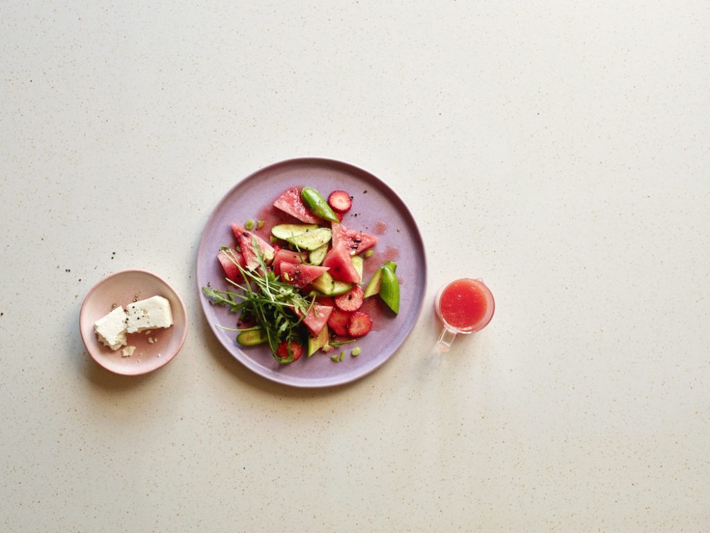 Ingredienti (per 4 persone): 400 g d’anguria; 250 g di fragole; 250 g di cetrioli snack; 1 cipollotto; 100 g di rucola o d’insalata a foglia. Condimento per l’insalata: 100 g d’anguria; 1 centimetro circa di zenzero; 2 c di Condimento Bianco; 3 c d’olio, ad esempio olio al limone; sale; pepe nero macinato fresco