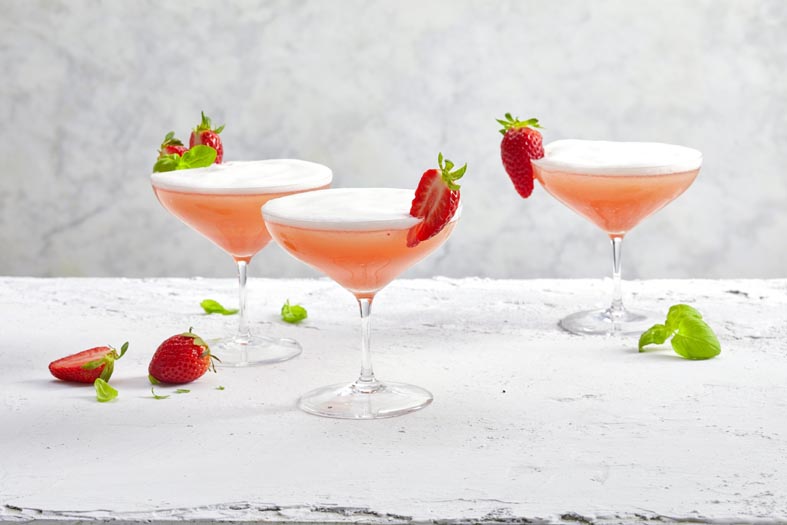 6. Versate il frosé in bicchieri da cocktail e guarnite con il basilico e le fragole messe da parte