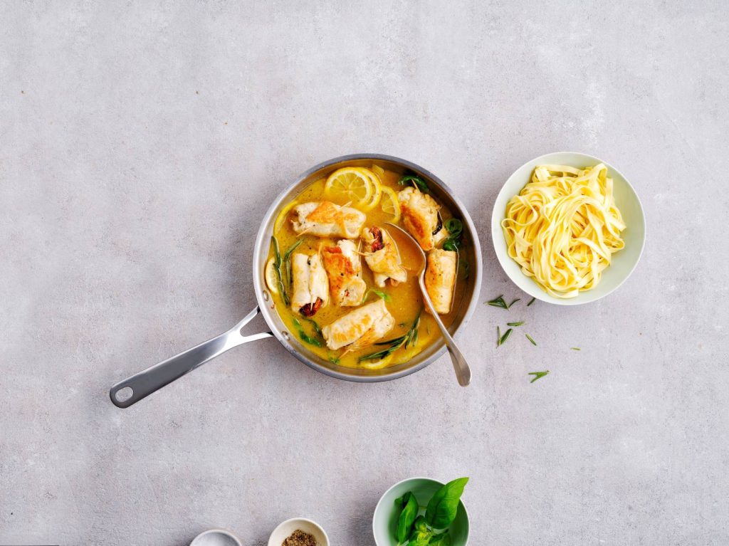 Ingredienti per 4 persone: 4 petti di pollo di ca. 120 g; 4 fette di prosciutto crudo; ½ mazzetto di basilico; pepe; 100 g di pomodori cherry semi secchi sott’olio, sgocciolati; 50 g di sbrinz; 1 limone; sale; 1 c di burro per arrostire; 3 dl di fondo di pollame; 2 rametti di rosmarino; 2 c di burro freddo;