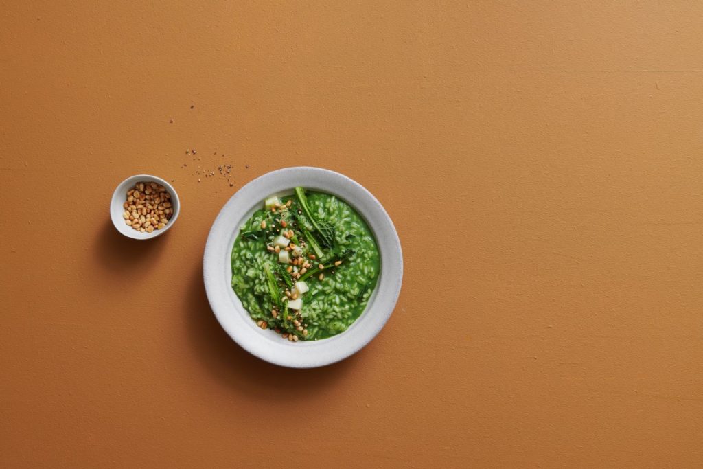5. Tagliate il taleggio a dadini. Aggiungete il cavolo piuma al risotto insieme alla metà del formaggio. Regolate di sale e pepe. Guarnite il risotto con il resto del taleggio e i pinoli di cedro.