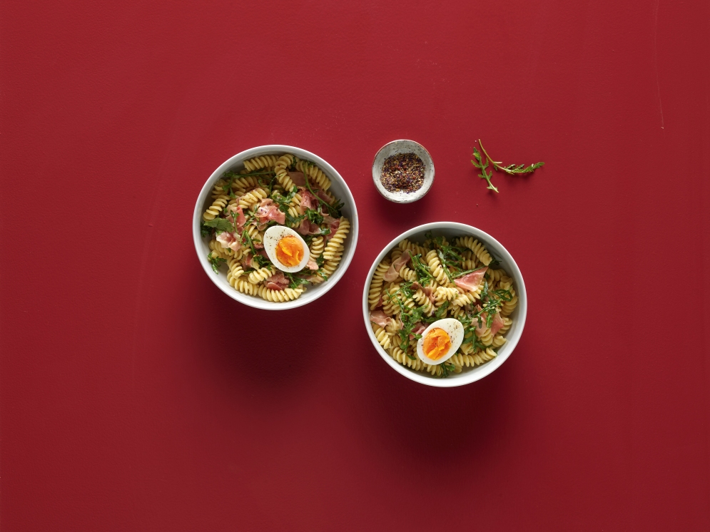 7. Mescolate la pasta con la salsa, il prosciutto e la rucola. Servite ogni porzione di pasta con un mezzo uovo e cospargete con una macinata di pepe.