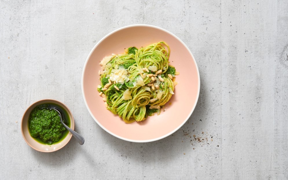 Ingredienti (per 4 persone): 500 g di spaghetti; pepe; parmigiano per condire; 20 g di pinoli. Per il pesto di aglio orsino: 100 g di aglio orsino; 75 g di pinoli; 60 g di parmigiano grattugiato; 2 dl di olio di colza; sale