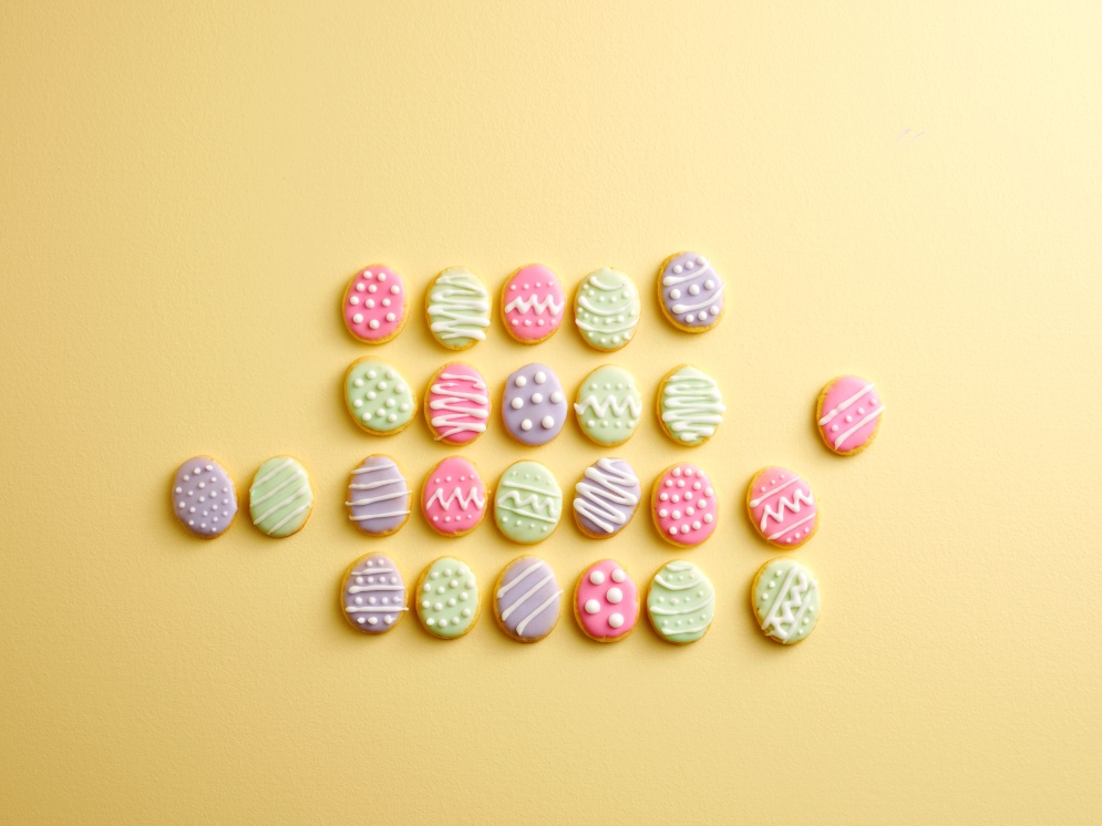 3. Spianate la pasta tra due fogli di carta da forno in una sfoglia di circa 5 mm di spessore. Ritagliate biscotti a forma di uovo e accomodateli su una teglia foderata con carta da forno. Impastate gli avanzi di pasta, spianateli di nuovo e ritagliate altri biscotti.