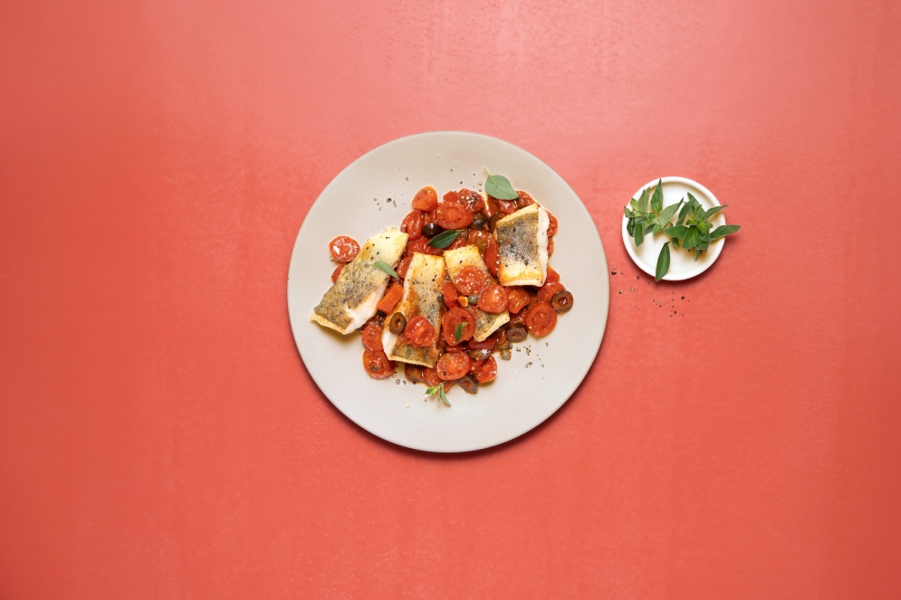 Ingredienti (per 4 persone): 2 spicchi d’aglio; 600 g di pomodori, ad es. a grappolo o cherry; 8 filetti d’acciuga sott’olio; 1 peperoncino; 100 g di olive Kalamata snocciolate; 6 cc circa, d’olio d’oliva; 3 cc di concentrato di pomodoro; 2 cc di capperi; 4 rametti d’erbe aromatiche, ad es. basilico oppure origano; 600 g di filetti di pesce, ad es. merluzzo o lucioperca; sale; pepe; farina per infarinare