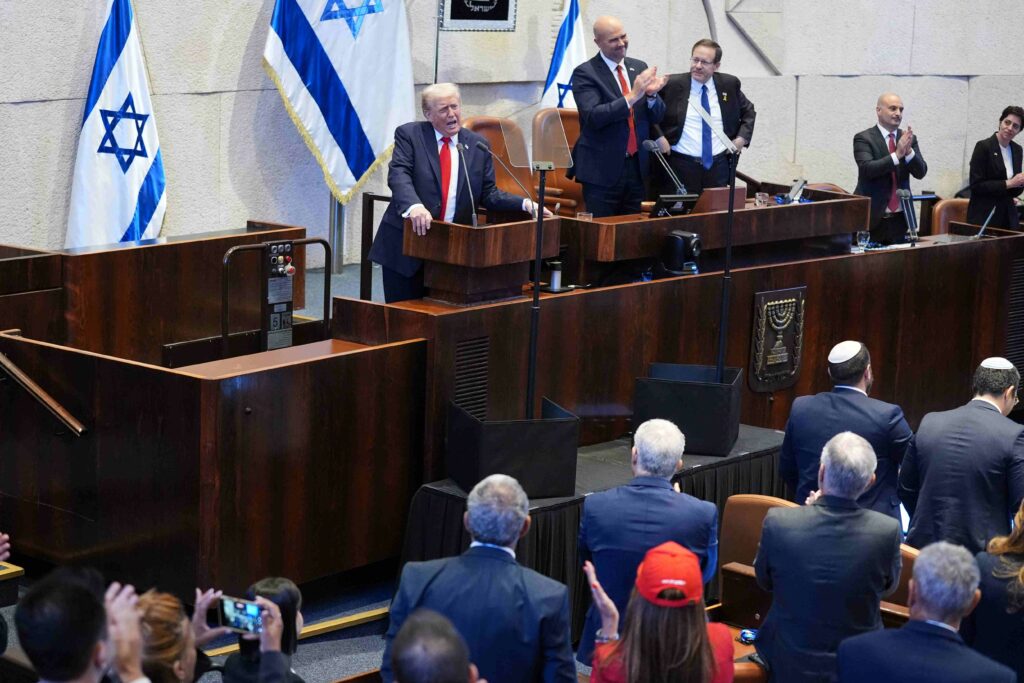 La tregua è cosa buona perché tutela almeno temporaneamente la sacralità della vita umana e concede l’ossigeno necessario per uscire dalla modalità di sopravvivenza. Da quando Trump ha proclamato la fine delle operazioni militari il sollievo del sistema nervoso è palpabile già al risveglio e, anche solo per questa leggerezza ritrovata – difficile forse da comprendere per chi ha vissuto la guerra da lontano – c’è senz’altro da ringraziare il presidente americano e la sua discutibile, imbarazzante autorità. I manifestanti e i parenti degli ostaggi lo hanno ringraziato sin troppo. Troppo perché, così come ha repentinamente scatenato l’euforia in un Paese traumatizzato, così ha anche riportato la Nazione, o almeno la parte razionale della medesima, con i piedi per terra, per non dire nella palude. Lo ha fatto con un’esibizione di oltre un’ora trasmessa in mondovisione dalla Knesset, il Parlamento israeliano, dove si è recato a ricevere gli onori non appena atterrato. L’oratoria di Trump richiede allo spettatore onesto un’operazione da equilibrista: rinunciare alla verità storica che è sotto gli occhi di tutti, sotto il ricatto di una pace ingiusta che, tuttavia, detiene l’oggettivo potenziale di preservare molte vite umane. Ad accoglierlo in pompa magna c’era, oltre ai suoi parenti e collaboratori, tutto l’establishment sionista, grato per essere stato salvato in extremis dal criminale vicolo cieco dove si è incastrato.