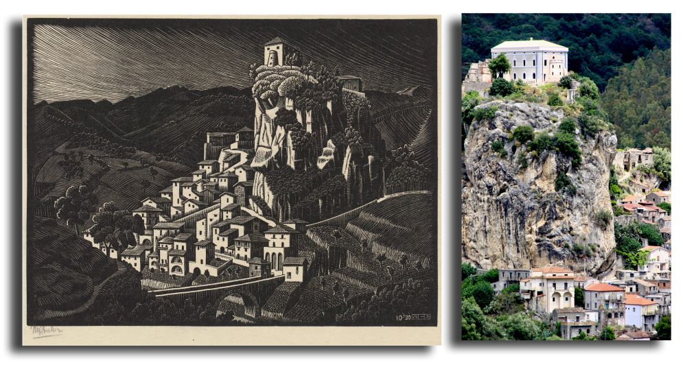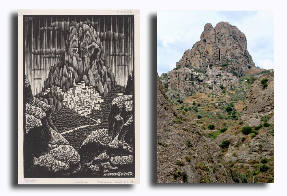 Escher scattò diverse fotografie durante quel viaggio, come spunto per la realizzazione di litografie e xilografie. Fu Pentedattilo a sconvolgere la sua mente, quella nuda montagna a forma di mano alla base della quale indugia un nugolo smarrito di casupole in pietra, dove abitano soltanto anziani, testardi, artisti e «il mercante di sogni», un gentiluomo dai capelli bianchi raccolti in una coda che vende sacchetti di manufatti realizzati dai bambini con materiali riciclati: «Un sogno in cambio di una monetina», ci ripete. Ha la voce del cantastorie. Gliene lasciamo due.