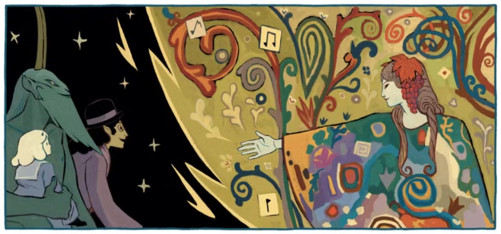Questa varietà di stili ha una funzione narrativa ridotta: solo a volte l’aspetto grafico specifico amplifica la scena che raffigura; e comunque per adattare il registro visivo a questa necessità basterebbero accorgimenti minori, senza cambiare del tutto corrente artistica e perfino, sembrerebbe, tecnica utilizzata. Potrebbe dunque apparire come un espediente esagerato e superficiale, puramente estetico, per suscitare stupore. E in questo è efficace. Ma in realtà la variazione stilistica marcata ricopre anche un’altra funzione importante, anzi fondamentale per completare l’esperienza di lettura: concentra il significato essenziale dell’intero racconto. Il puro divertimento visivo non manca del tutto di utilità pratica, ma le preferisce intenzionalmente il potere di ammaliare e ubriacare attraverso la bellezza, anche fine a sé stessa. Questo è proprio ciò che fa Eustis con le sue storie.