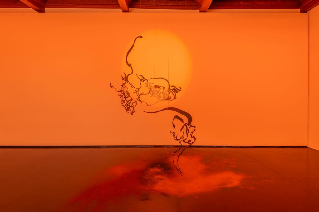 Da una parte, uno spazio cupo con pareti scure è dominato dall’opera Reversion (Wudu Diorama), un’installazione composta da travi in legno cosparse di spezie. Dall’altra, uno spazio illuminato dalla luce arancione di due soli accoglie eleganti sculture sospese, realizzate in acciaio, che racchiudono riferimenti all’aniconismo dell’Islam e alla conseguente nascita della tradizione calligrafica araba. Sotto di esse, la polvere di curcuma, peperoncino, cannella e cumino sparsa sul pavimento genera magici ornamenti e stuzzicanti fragranze che rivelano la fiducia in un futuro migliore.
