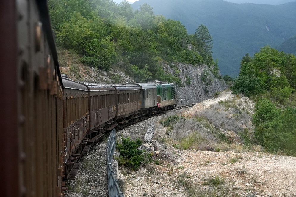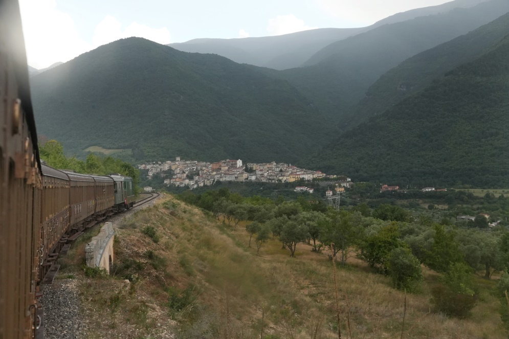 Un lungo fischio annuncia l’arrivo del treno alla stazione di Sulmona, trainato da una vecchia locomotiva diesel degli anni Sessanta. Ogni scompartimento ha la sua porta d’ingresso, infatti si chiamano vagoni cento porte, e basta salire i tre gradini di legno per entrare in un altro mondo, fatto di odori antichi e luci calde, lungo un corridoio centrale che divide i vari scompartimenti con le panche di legno. Appena usciti da Sulmona, il treno inizia a salire verso le cime dei monti dell’Appennino. A volte arranca, rallenta ma poi riprende la sua corsa. Il paesaggio è bellissimo, piccoli paesi sono arroccati sulle pareti dei monti della Maiella, boschi di faggio si alternano ad altopiani.