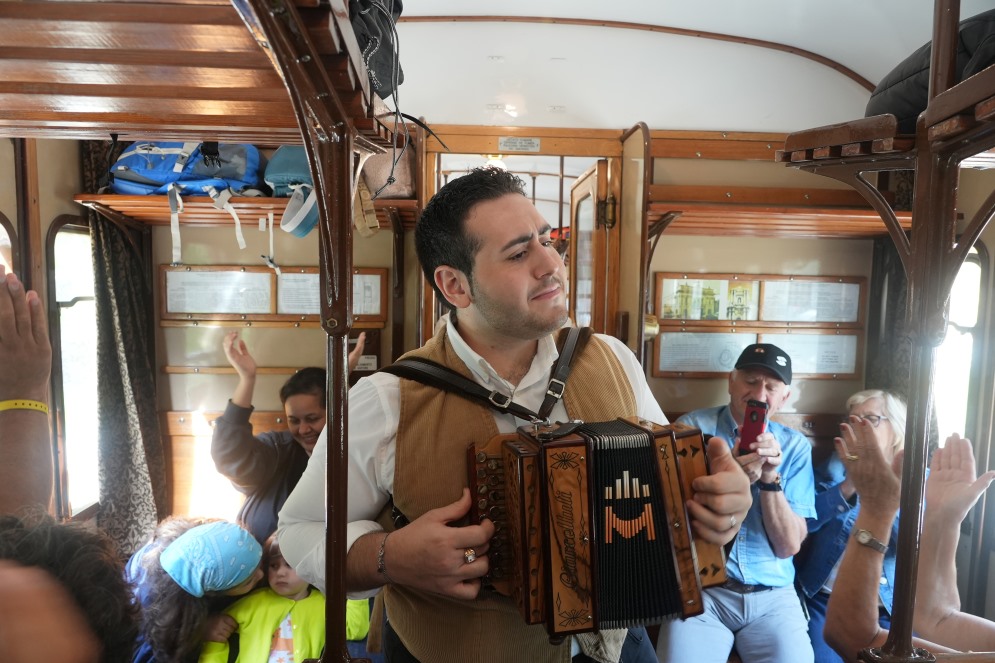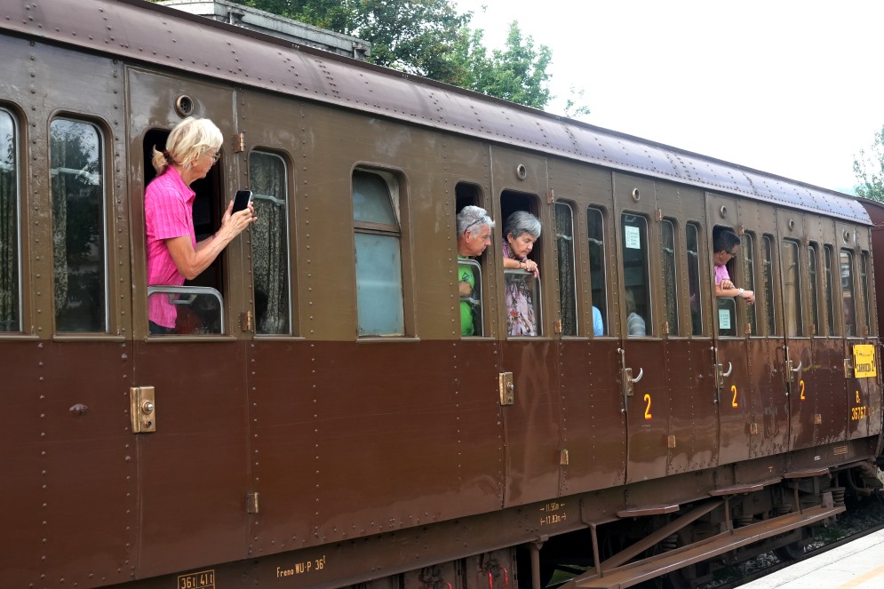 Finita la cantata, Paolo, con il suo cappellino arricchito da una spilla con la bandiera canadese e quella italiana, mi dice che «questa era una canzone che cantava sempre mio padre in Canada. Io sono nato tra questi monti, ma a pochi anni d’età mi hanno portato nella terra dello sciroppo d’acero», si aggiusta il cappellino, si gratta il naso importante per poi guardarmi di nuovo con quei suoi occhi azzurro acqua: «Io non avevo mai preso questo treno ma mia moglie ne parlava ogni tanto e così, al nostro ritorno in Italia per le vacanze eccoci qui sul vagone. Devo dire che è un modo originale e bello per scoprire queste terre meravigliose».