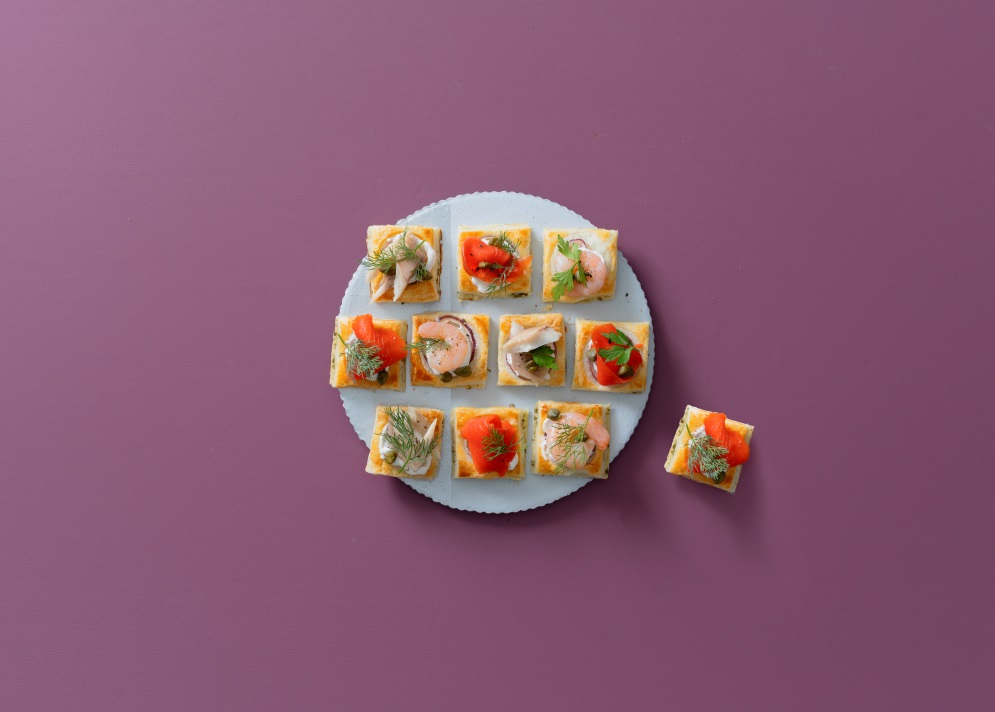 Ingredienti (per 40 pezzi): ½ mazzetto d’erbe aromatiche miste per insalata, ad es. aneto, prezzemolo; 2 c di capperi; 200 g di creamy cottage cheese; sale; pepe; 3 piccole cipolle rosse; 2 paste sfoglie rettangolari già spianate da 320 g l’una; 1 uovo; 100 g circa di salmone affumicato; 100 g circa di gamberetti cotti; 100 g circa di filetti di trota affumicati