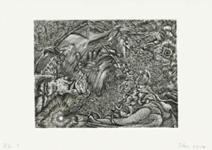 Al bulino, la più antica e nobile tra le prassi incisorie, Raetz si è avvicinato proprio nel 1994, quando, con alle spalle già più di trent’anni di esperienza nell’ambito della grafica, viene invitato a realizzare un’opera per la Chalcographie du Louvre. Il rapporto di Raetz con questa tecnica raffinata si è fatto sempre più intenso nel corso del tempo, dando vita a esiti artistici che hanno combinato con maestria metodo e immaginazione.