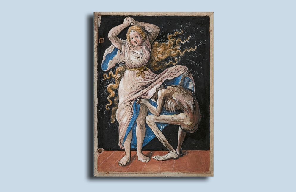 Il suo dipinto in miniatura La morte e la ragazza del 1517 ritrae una figura in avanzato stato di decomposizione che inginocchiata solleva la gonna della ragazza e vi inserisce la testa. Per contro la ragazza dai lunghi capelli biondi e ricci alza le mani in segno di orrore e contemporaneamente mostra un viso tra lo spavento e il sorriso. Piacere e morte; qui la vanitas scompare per far posto a un triplo gioco perverso, come forse non ce ne sono altri. Dipinto cinque secoli or sono è ancor oggi una vera rivoluzione. Guardatelo ascoltando il quartetto d’archi di Franz Schubert composto verso il 1817 intitolato appunto La morte e la fanciulla tratto dai versi omonimi scritti da Matthias Claudius.